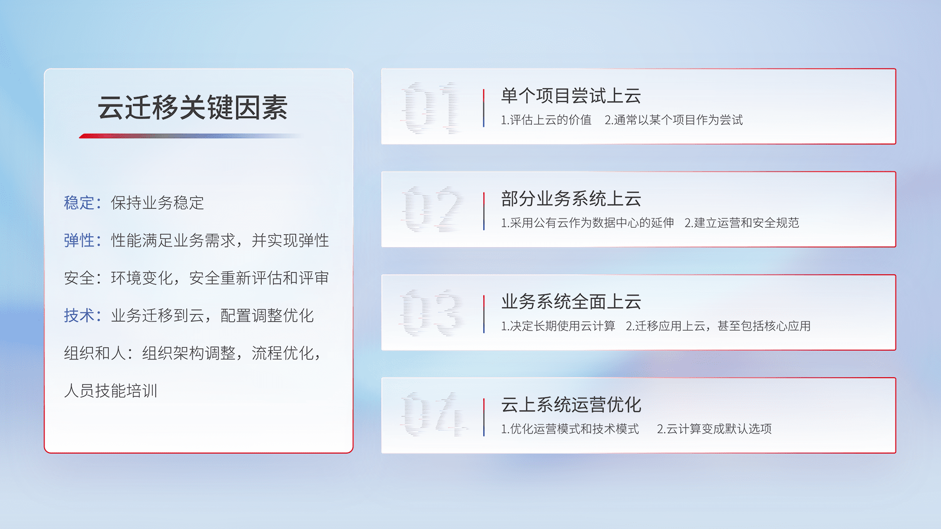 结合实际业务,,从规划设计、、、、云平台选型、、、云原生改造、、、数据迁移、、、集成交付,,迁移全过程为客户识别最佳上云路径,,,做好风险识别管理,,,设计网络架构、、身份权限、、、、安全审计合规、、操作审计、、、日志审计、、监控告警策略、、多站点容灾设计等,,对云上基础设施进行整体规划,,提升IT治理水平,,,,以满足弹性、、、、高可用、、、高性能的需求。。。