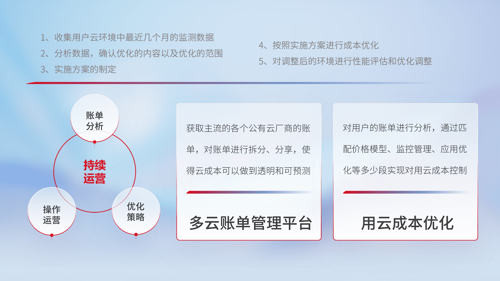 通过多云纳管,,,以统一的资源数据模型把客户的云资源进行抽象和封装,,,,进而实现对多云资源的统一操作,,,,保障云资源管理的可靠性、、、、稳定性与可用性。。。量身定制化运维内容,,,配置、、、、开发运维、、补丁管理、、、备份、、、监控、、、认证和访问管理、、审计和日常巡检等,,保障在用云过程中的可靠度,,,,稳定度以及高可用率。。。